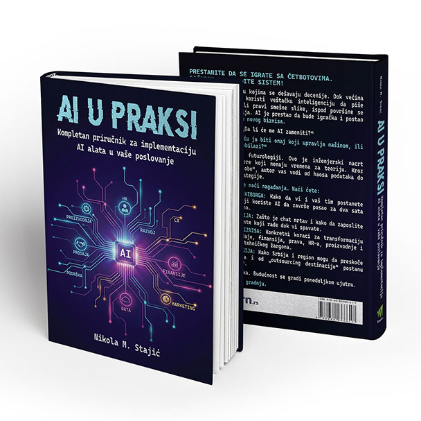 „Nikolina knjiga Al u praksi: Kompletan priručnik za implementaciju AI alata u vaše poslovanje je tačno ono što većini firmi treba u ovom trenutku. Nije još jedna ’AI je budućnost’ brošura, nego operativni vodič koji vas uvodi iz faze igranja sa alatima u fazu stvarne primene... priručnik koji vredi držati na stolu, ne u fioci.”